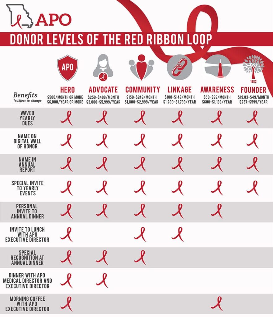 Your participation in the Red Ribbon Loop is an easy way for those looking to give, to help us continue our mission of caring for those living with HIV/AIDS. The funds raised from the Red Ribbon Loop are used to provide vital care to those living with HIV in the 29 counties of Southwest Missouri that APO serves.